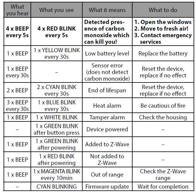 Note: If the self-test procedure does not result in emitting sound” and red light signal, replace the device.