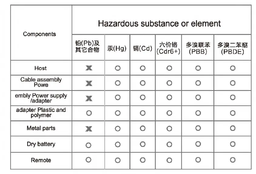 This table shows the hazardous substance information contained in this device. The hazardous substance information of the parts is based on the information provided by the supplier and the internal inspection results. The hazardous substances contained in some parts are impossible to replace under the current technical standards.