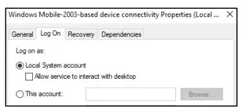 Once that is set on both services, stop the Mobile-2003 service if it is running. Then stop and start the Windows-mobile-based device connectivity service. Once that service is running, Start the