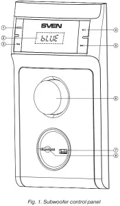 : previous track (pressed short in Player and Bluetooth mode)- EQ: equalizer mode switch button Fig. 1. Subwoofer control panel (in Player mode)