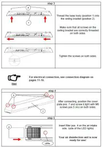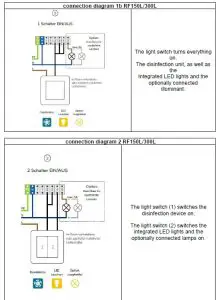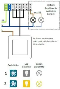 | 1. The light switch is switched on. Disinfection device, integrated LED lights and optionally connected lamps are OFF. 2.The light switch is switched off and on again. Disinfection device, integrated LED lights and optionally connected light sources are ON. 3 The light switch is switched off and on again. Disinfection device is ON. Integrated LED lights and optionally connected light sources are OFF. 4.The light switch is switched off and on again. Disinfection device is OFF. Integrated LED lights and optionally connected light sources are ON. |
