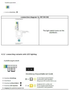| 1. The light switch is switched on. Disinfection device, integrated LED lights and optionally connected lamps are OFF. 2. The light switch is switched off and on again. Disinfection device, integrated LED lights and optionally connected light sources are ON. |