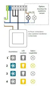 Connection diagram of your device depending on the unit and the light switch in the room. In the following table you will find and overview of the possible connecition diagrams.