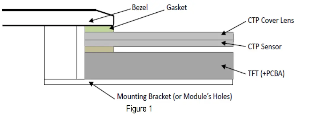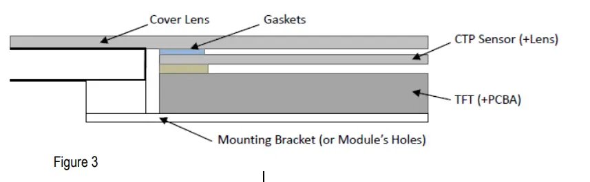 - It is recommended to provide an additional support bracket with gasket for backside support when necessary (e.g. TFT module without mounding structure). They should only provide appropriate support and keep the module in place.