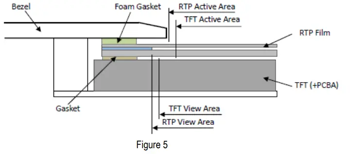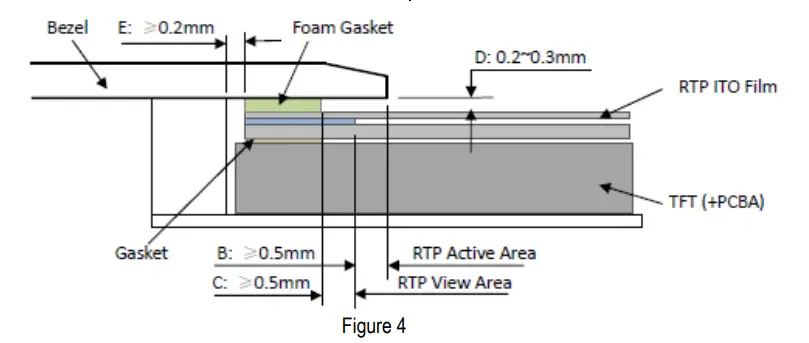 (Figure 4) - The bezel side wall should keep space E= 0.2 ~ 0.3mm from the RTP. (Figure 4)