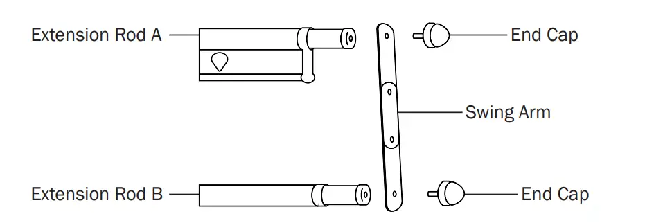 - Hook one end of the swing arm onto Extension Rod A, and the other end onto Extension Rod B, screw on the end cap tightly. Repeat with the other swing arm.