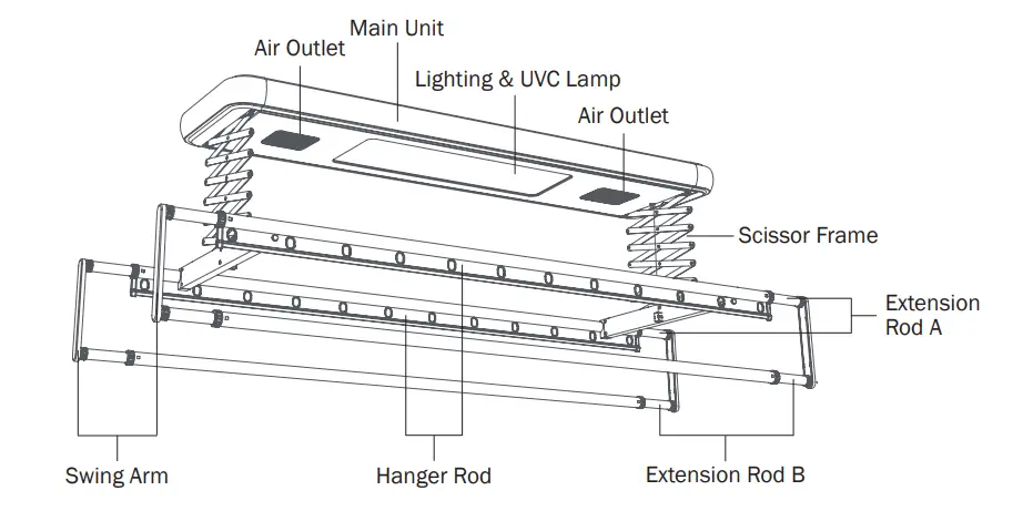 - When you need to use Extension Rod B, swing it downwards, and swing it back up onto the hanger rod after use.