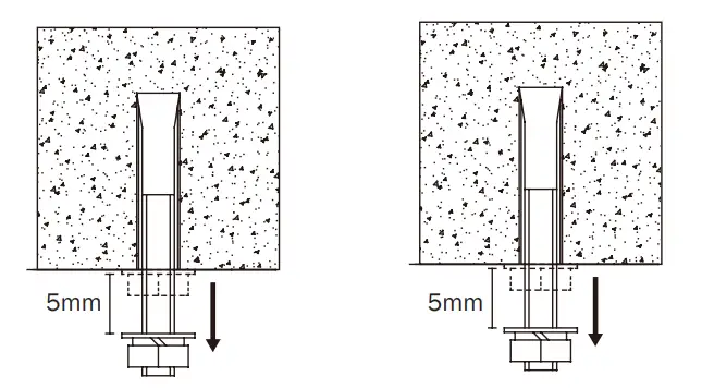 - Install the expansion anchors into the drilled holes and tighten the screws. On one end, loosen the 2 lower bolts of the expansion anchors so that there is a 5mm gap between the upper and lower bolts; on the other end, take the 2 lower bolts off completely.