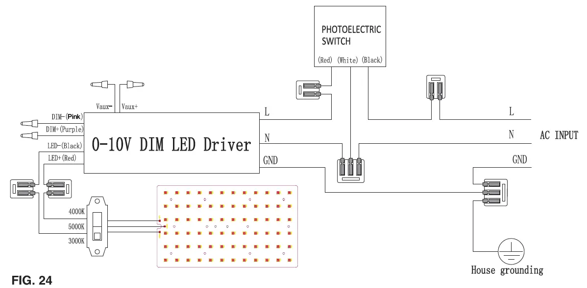 - The FIG. 23 to FIG. 26 demonstrates the interior wiring of four different configurations in the driver compartment (When need to remove or replace any component in the driver compartment, please refer to the below wiring FIG. 25 to FIG. 28 and base on the actual condition, resume using the fixture by wire connecting).