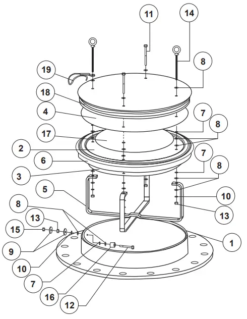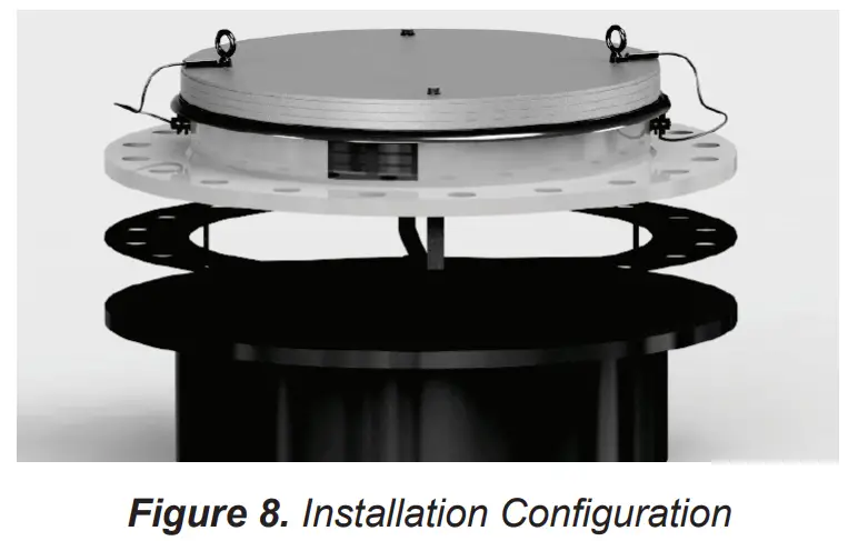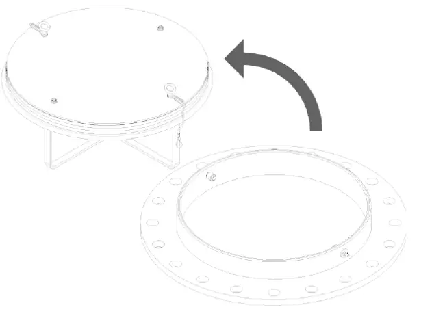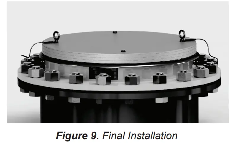 - Before tightening hex nuts, ensure that the eyelet on the lanyard(s) is pointing away from the center of the lid. Failure to do this may result in damage to the tank by preventing the unit from opening fully in a pressure event. Tighten each nut to 1 turn after snug.