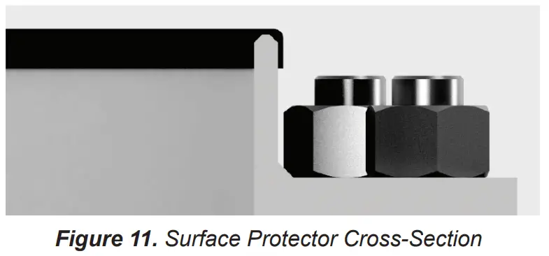 The following instructions are applicable only if the sealing surface protector was also purchased for your unit. This guard is available to prevent damage to the sealing surface when the Enardo 2100 Series is being used for tank access or for running air or weld leads into the tank. Figure 10. Surface Protector Installation Figure 11. Surface Protector Cross Section