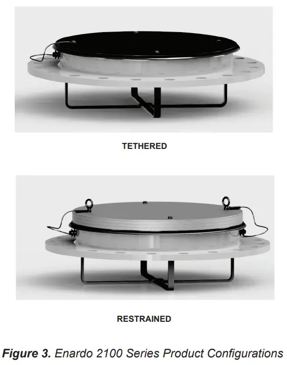 The Enardo 2100 Series Emergency Pressure Relief Vent is designed to provide simple, reliable operation as an emergency vent, while providing efficient access to your tank and maintaining the industry leading sealing standards (1 SCFH at 90% set point). It also provides trouble free operation with a minimum maintenance. There are two available configurations for Enardo 2100 Series: tethered and restrained (see Figure 3).