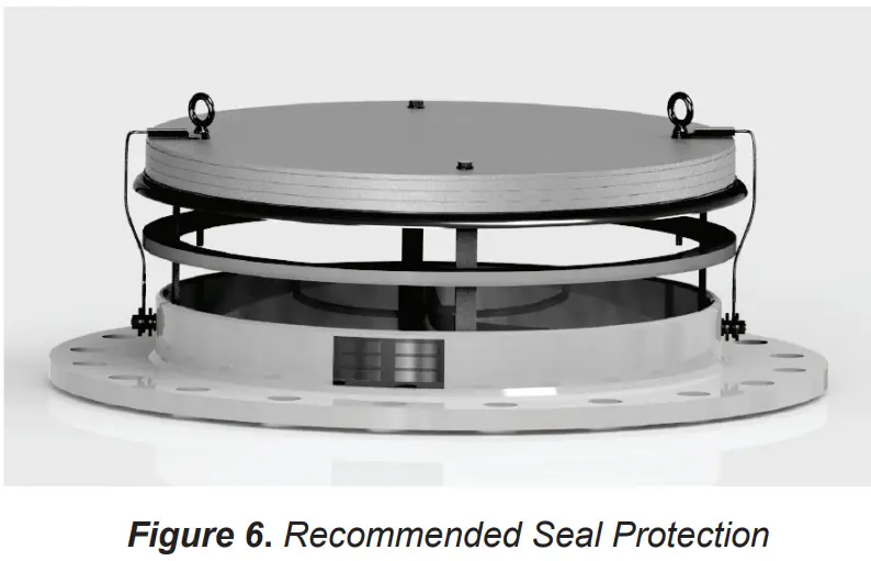 The sealing surface protector must be removed before the Enardo 2100 Series is returned to service. The vent will not seal with the protector in place.