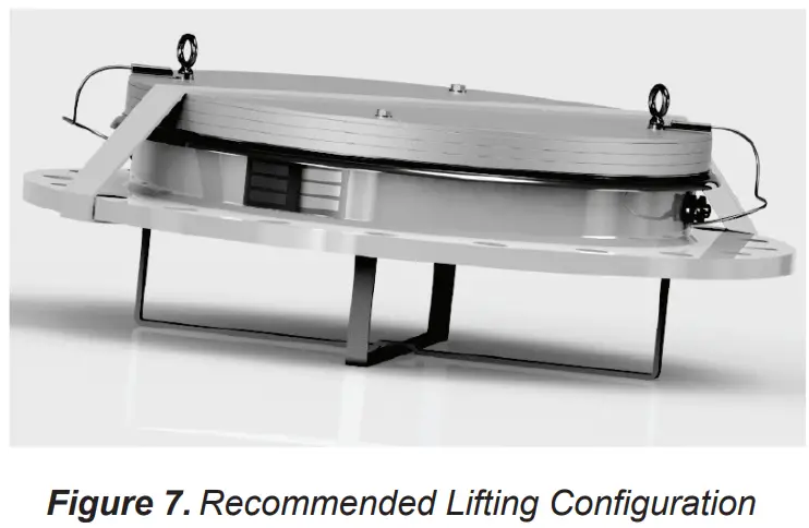 There should be no tension on the lanyards if the unit is to be hoisted in position, failure to do so may result in damage to the unit. - Use an appropriate spreader bar when lifting the unit by the installed eyebolts. If the complete unit is to be hoisted into position using installed eyebolts, first secure the base to the lid so that there is no tension on the lanyards. Lanyards are load-rated to 350 lbs / 160 kg each; damage to other components may occur.