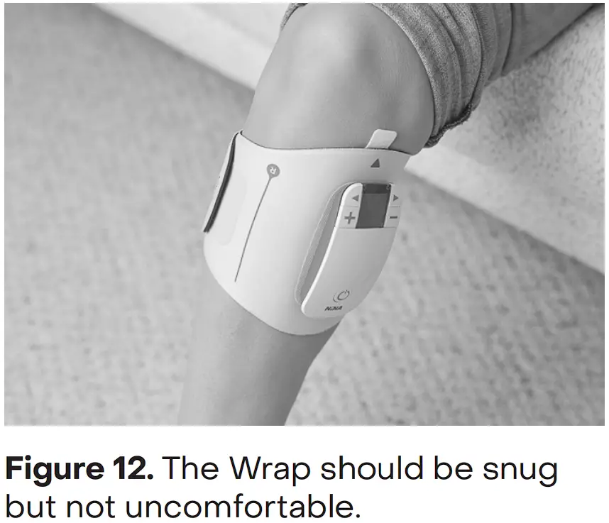 - With the NiNA display facing up towards the head, firmly press the Pad in place and secure it with the Wrap using the hook and loop fasteners to hold it in place (Figure 11). The Wrap should be snug on the leg but not so tight that it is uncomfortable (Figure 12).
