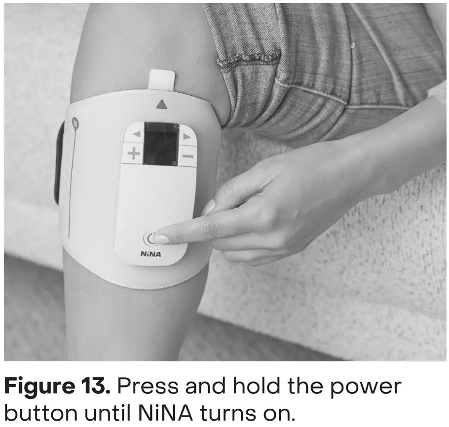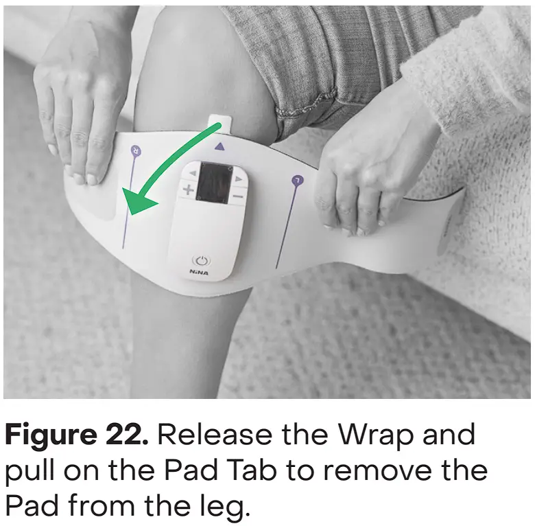 - Press and hold the power button until NiNA powers off (Figure 21). Release the Wrap and pull on the Pad Tab to remove the Pad from the leg (Figure 22).