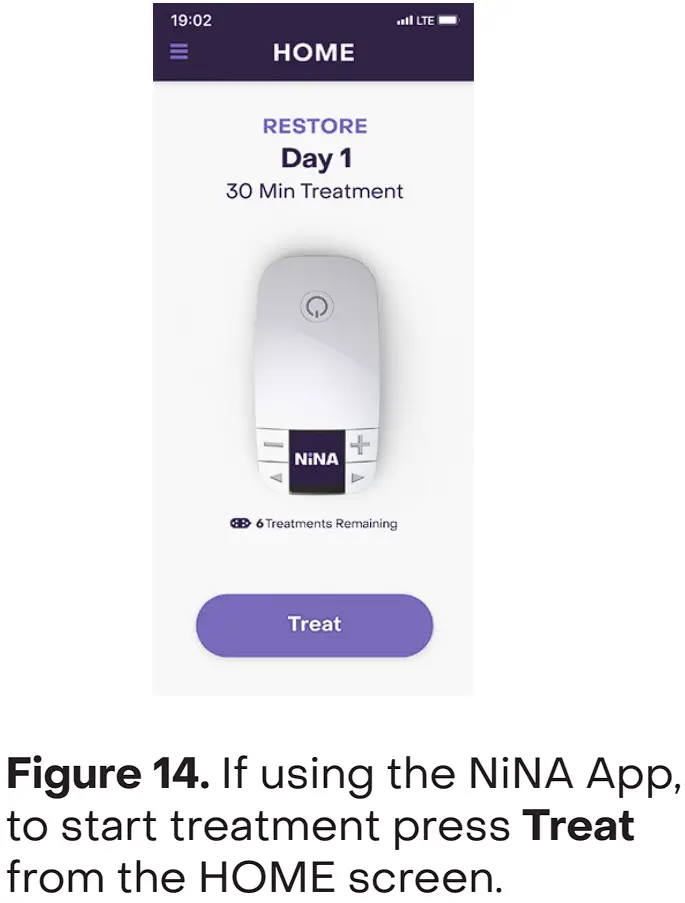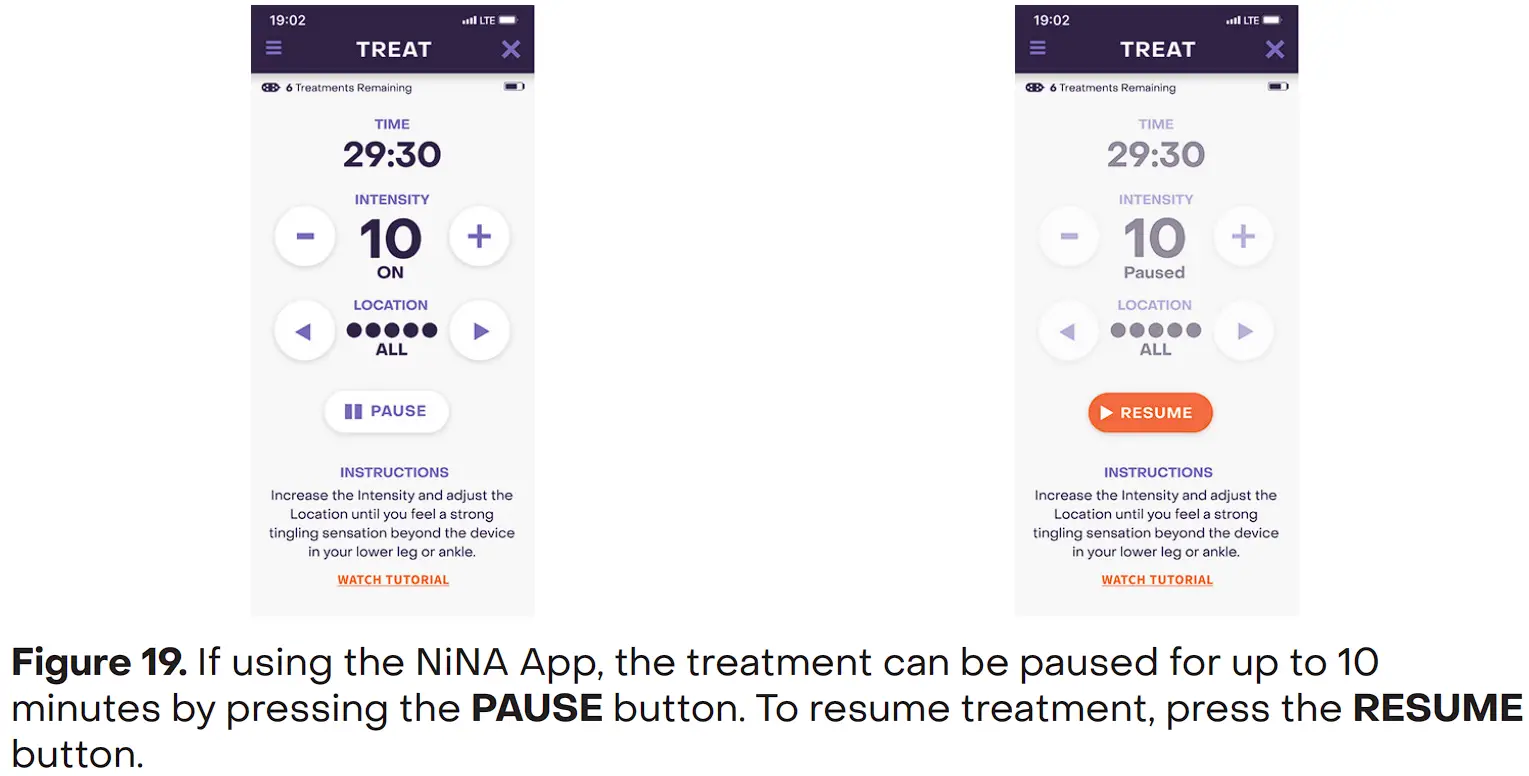 - If the NiNA App is used, therapy can be paused for up to 10 minutes by pressing the PAUSE button. Press the RESUME button to continue the therapy session (Figure 19). If therapy is paused for more than 10 minutes, the therapy session stops and must be restarted for the full 30-minute treatment session.