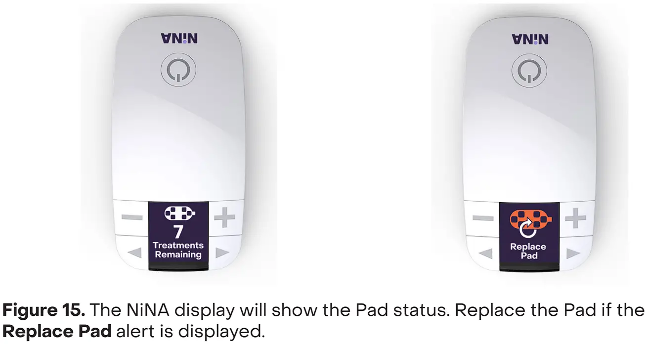 - The NiNA display will briefly show how many treatments are remaining for the Pad. It can be used seven times before a new Pad is required. If a Replace Pad alert is displayed, replace the Pad with a new one before beginning treatment (Figure 15).