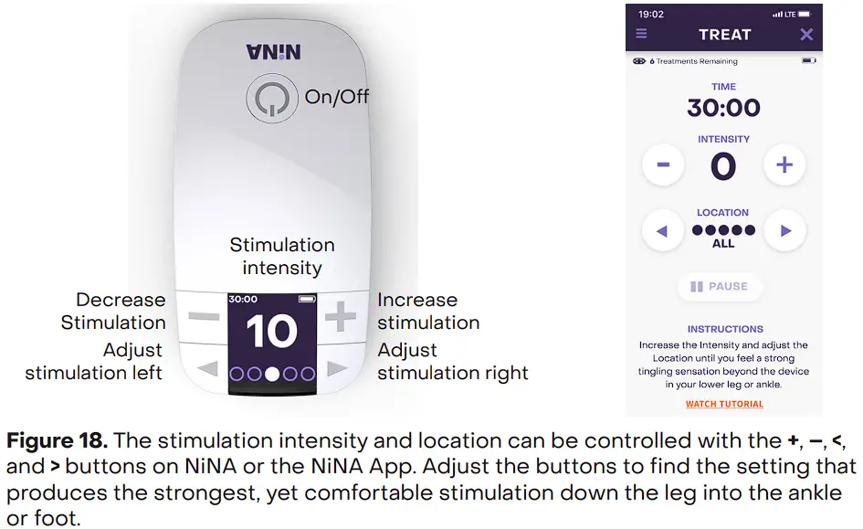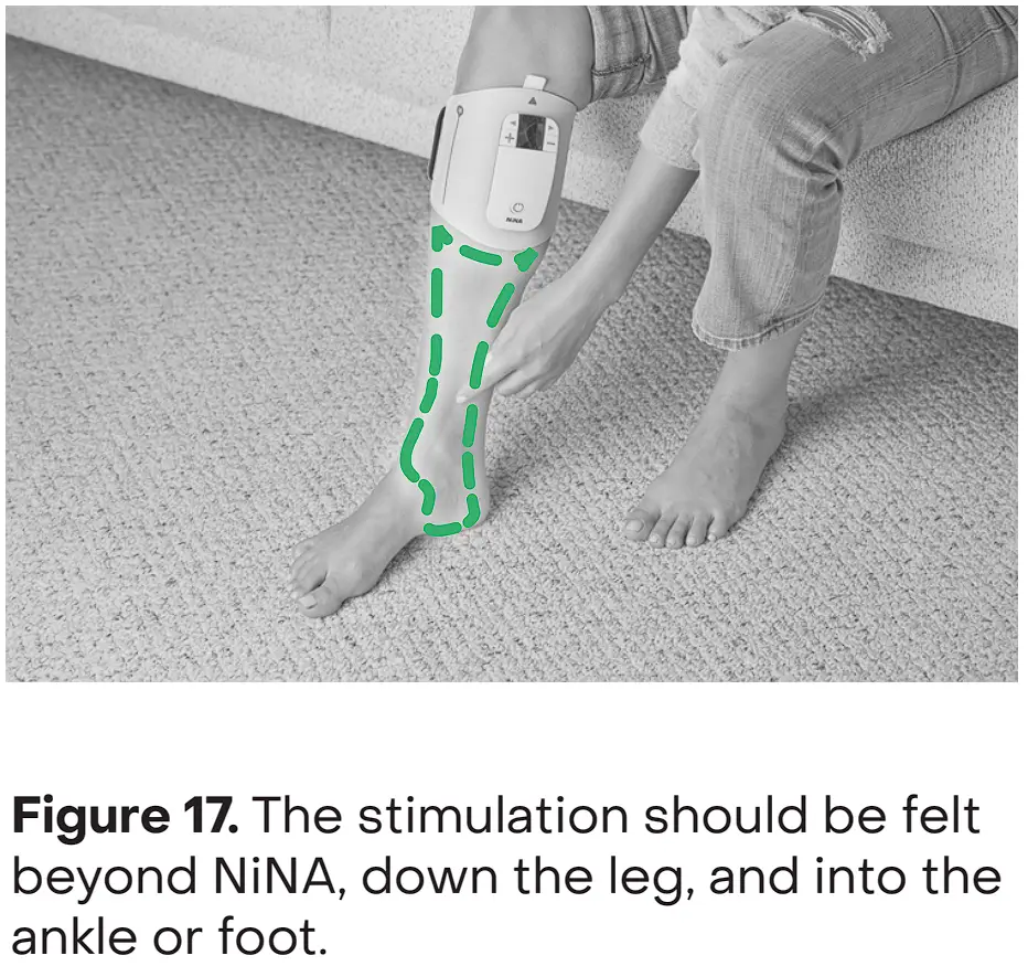 - For optimum treatment, the stimulation (tingling sensation) should be felt beyond NiNA, down the leg, and into the ankle or foot (Figure 17).
