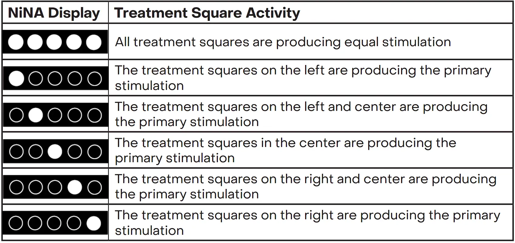 There are six treatment location settings. The location circles on the NiNA display or the NiNA App indicate which treatment squares on the Pad are producing the primary stimulation as illustrated in Table 1.