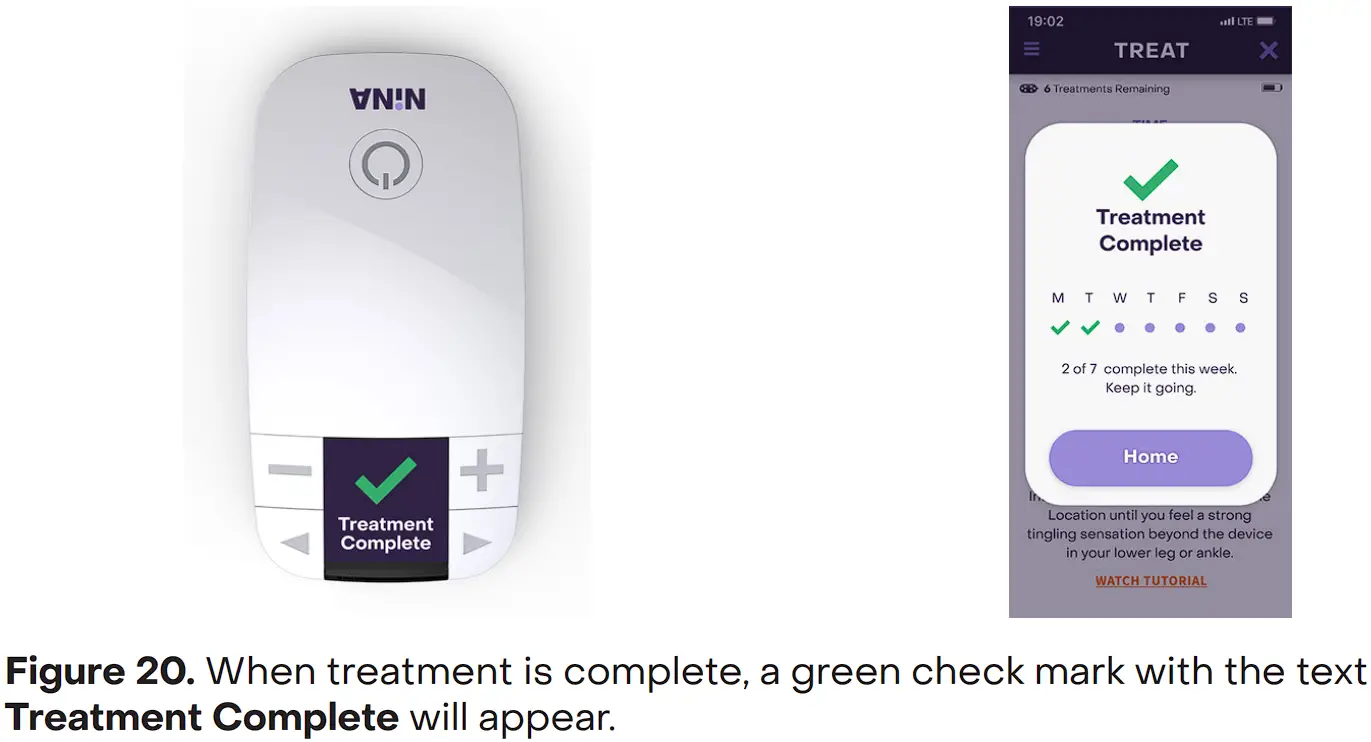 - NiNA will automatically turn the stimulation off after 30 minutes of treatment. A green check mark with the text Treatment Complete will appear on the NiNA display or in the NiNA App (Figure 20).