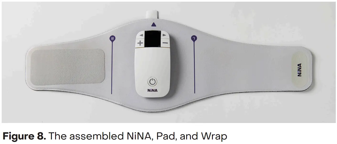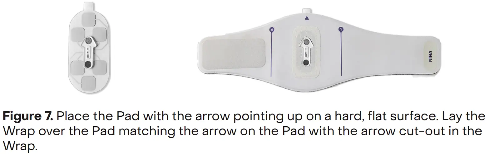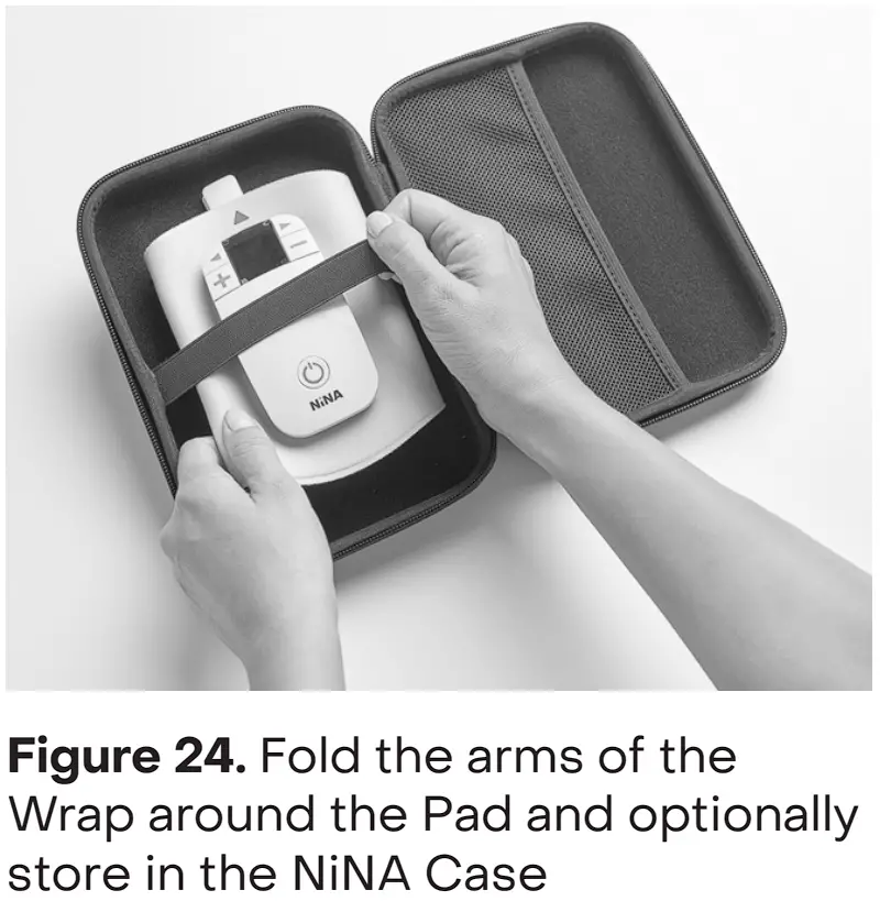 - If the Pad has been used for seven treatments, separate NiNA from the Pad by pulling NiNA straight up. Discard the Pad in the trash. If the Pad has been used for less than seven treatments, fold the arms of the Wrap around the Pad and optionally store the assembled NiNA in the NiNA Case (Figure 24).