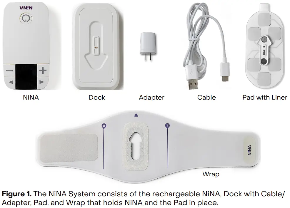 The EBT Medical Non-Invasive Neuromodulation Assistant (NiNA) uses transcutaneous electrical stimulation of the saphenous nerve to treat symptoms of overactive bladder. NiNA delivers mild, adjustable electrical stimulation pulses to the saphenous nerve just below the knee that help to restore the bladder-brain connection. The NiNA System™ (Figure 1) consists of the rechargeable NiNA, Dock, Pad, and reusable Wrap that holds the Pad and NiNA in place on the inside of either leg just below the knee crease (Figure 2).