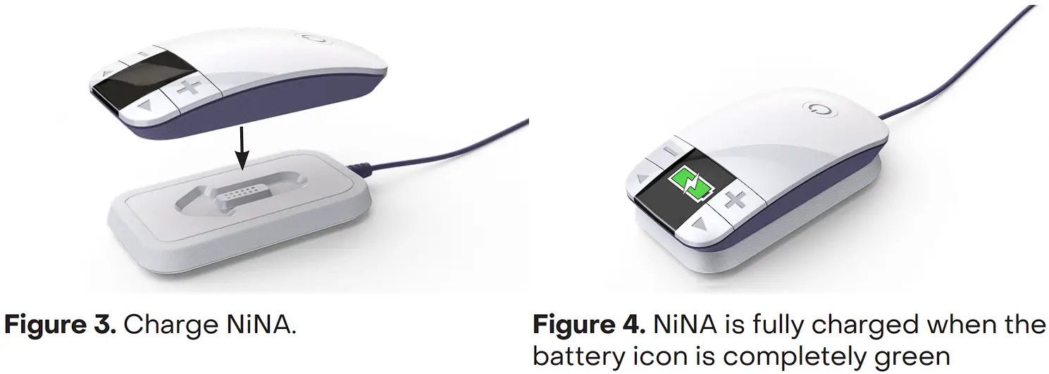 Before using NiNA it should be fully charged. Plug the Dock into any household AC socket using the provided Cable/Adapter. Place NiNA on the Dock as shown in Figure 3. When NiNA is fully charged, the battery icon on the NiNA display will change to completely green (Figure 4). When fully discharged, NiNA takes approximately 3 – 4 hours to fully charge.