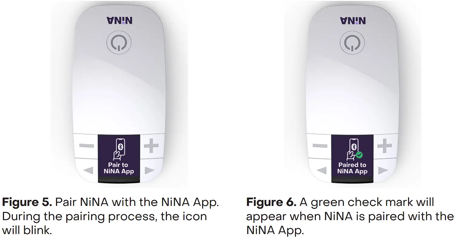 It has additional features not found on NiNA including reminders for performing therapy, progress tracking, tutorials and checks for ensuring proper therapy delivery, educational content, and instructional videos. - Follow the instructions on the NiNA App to log in and begin the pairing process using Bluetooth®. Turn on NiNA by holding down the power button until it turns on. Place NiNA close to the phone and follow the instructions in the NiNA App to pair the phone with NiNA. During the pairing process, the icon on the NiNA display will blink (Figure 5). When pairing is successful, a green check mark appears on the NiNA display (Figure 6).