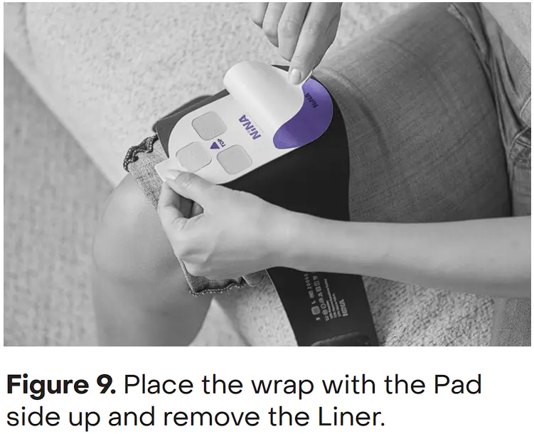- Turn the assembled NiNA, Pad, and Wrap over so that the Pad side is facing up (Figure 9). Remove the Pad Liner and save it for later use. After the treatment session is over, the Liner is placed back on the Pad to keep it clean. Avoid touching the sticky Pad until it is placed on the leg.