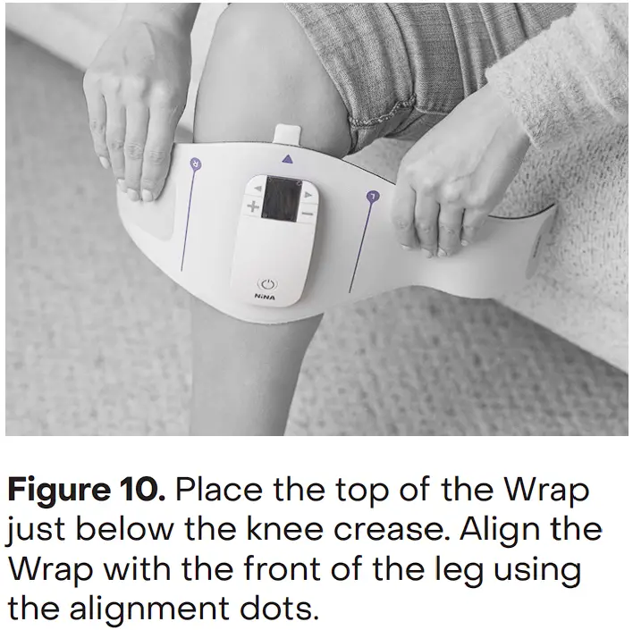 - Correct placement of NiNA is key to effective treatment. The NiNA/Pad is placed on the skin over the saphenous nerve just below the knee on the inside of either leg. To ensure correct placement, first locate the area between the edge of the shin bone and the edge of the calf muscle on the inside of either leg. With the knee bent, place the NiNA/Pad so that the top of the Wrap is just below the crease of the knee and the NiNA/ Pad is over the area that lies between the edge of the shin bone and the edge of the calf muscle. If the right leg is used, align the red “R” dot with the front of the right leg and if the left leg is used, align the blue “L” dot with the front of the left leg (Figure 10).
