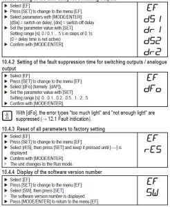 | [- -] | too little light, no object | OFF | ON | OFF | ON | 20,5 mA / 10 V | 3,5 mA / 0 V | NoData | UL |