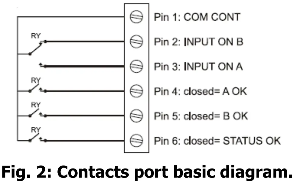 The contacts port is formed using six (6) pins numbered from left to right (see fig. 1), which can be connected to an external monitoring system (such as a BMS) in order to monitor the operational status of the ATS.