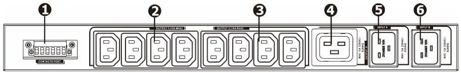 For connecting the ATS, plug “input source A connector” and “input source B connector” to the two independent power sources or UPSs depending using the SCHUCKO-IEC or IEC-IEC 16A cables supplied. Plug the user load to the output 10A (“Output 1 and 2”) or 16A (“Output 3”) sockets depending on user’s requirements.