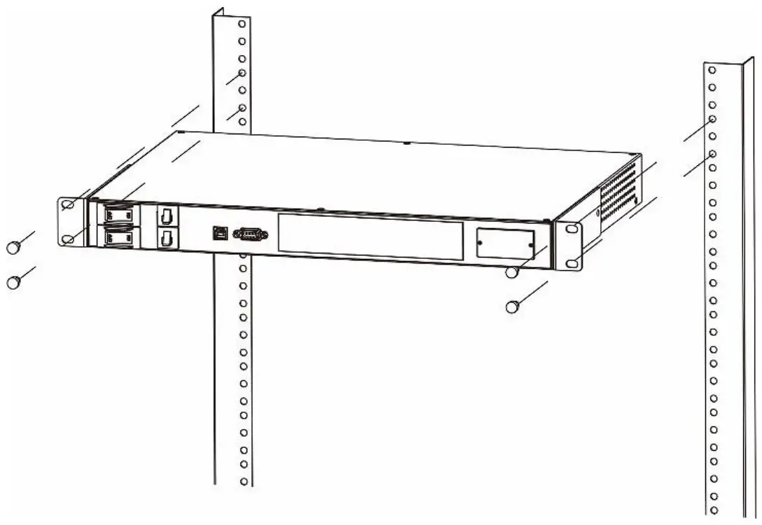 The unit can be mounted in a standard 19″ rack. Fasten the mounting brackets to the unit using the screws provided. With brackets attached securely, users can mount the unit in a standard 19″ rack as shown below.