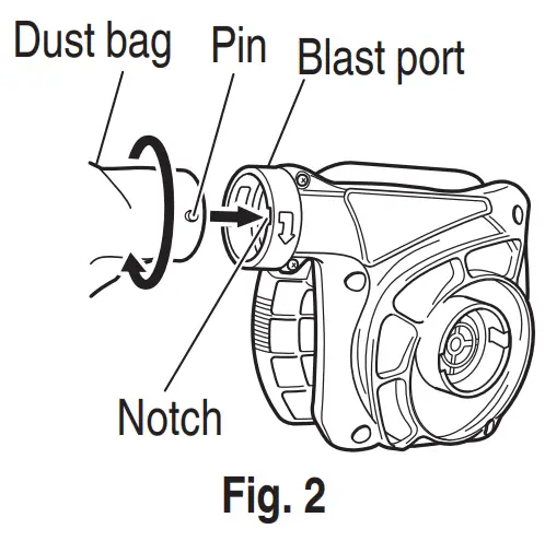 Mount the dust bag on the blast port, following the same procedures described above for mounting of the nozzle (Fig. 2).