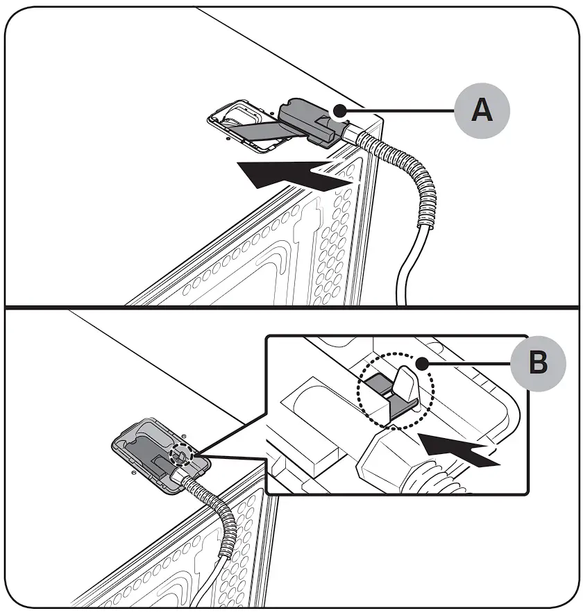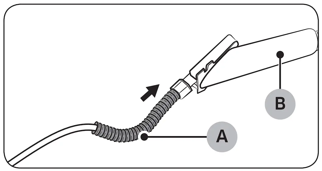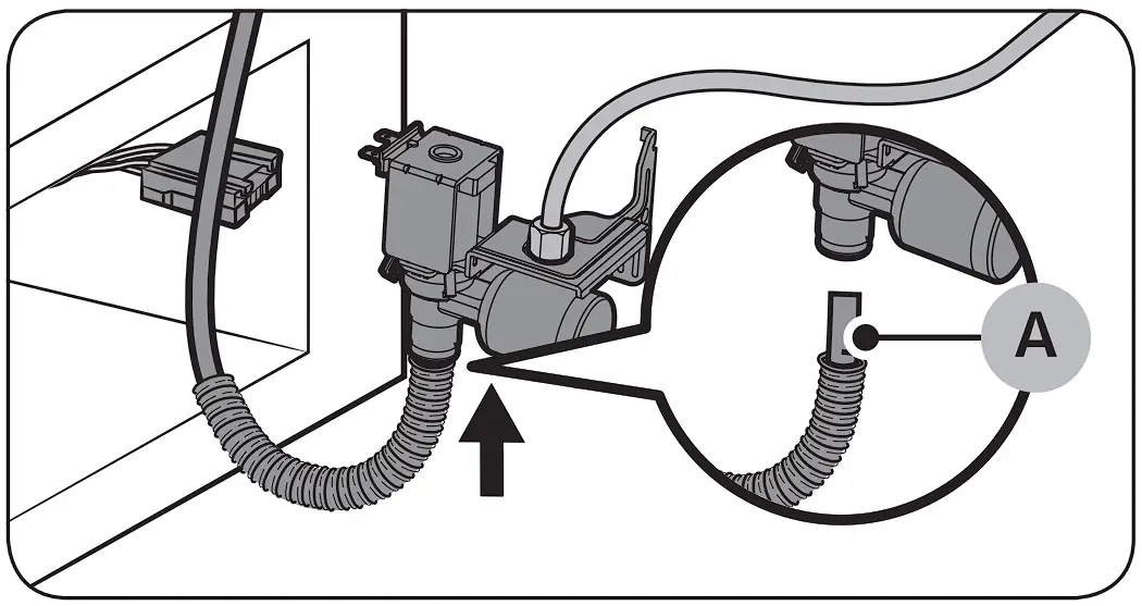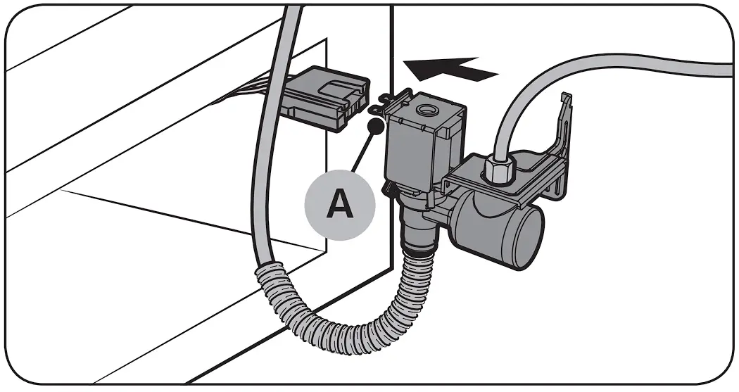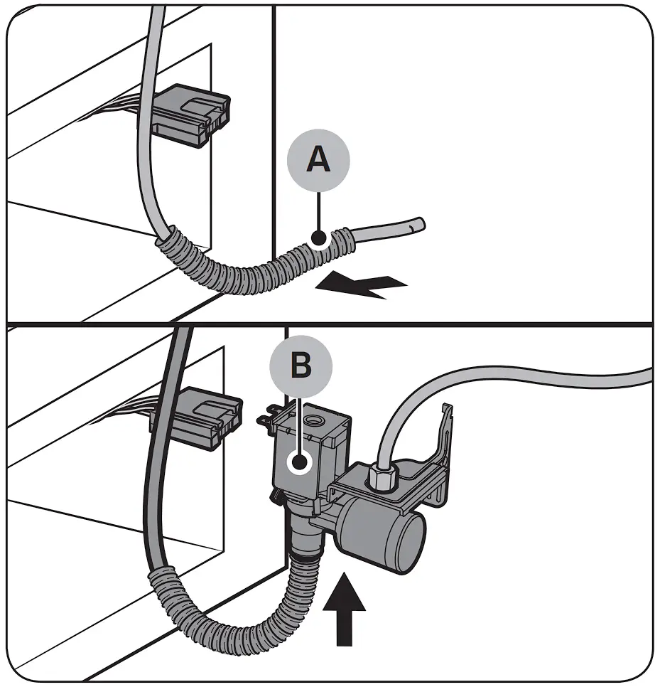 - Slide the flexible tube (A) towards the water inlet tube (B) (with a white water line) and secure it to the water inlet tube (B).