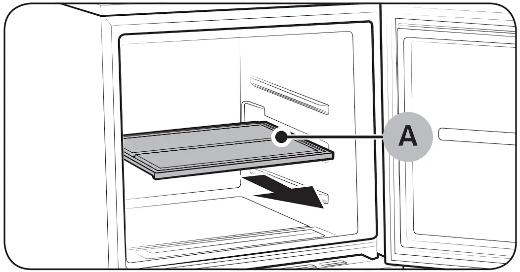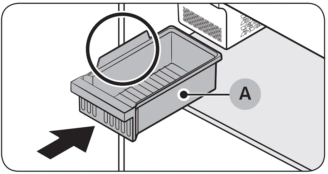 - Put the ice bucket (A) on the shelf as shown. By design, the ice bucket (A) is supposed to sit behind the ice maker.
