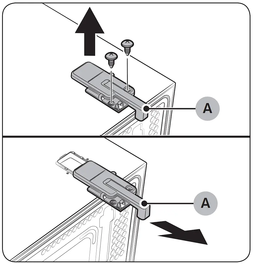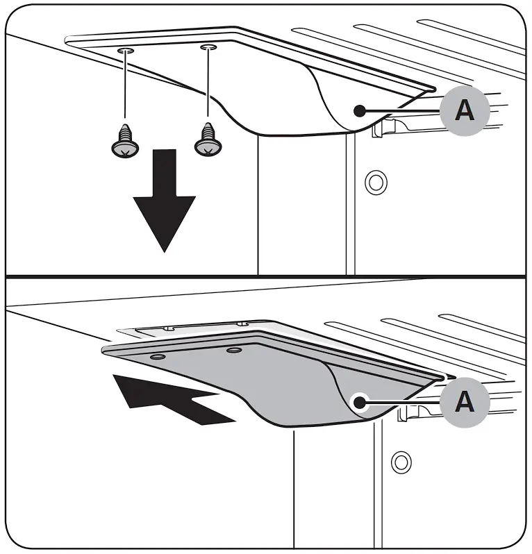 - Remove the screws fastening the cover (A) on the inner upper corner of the freezer. Then, remove the cover (A) by pulling it to the front.