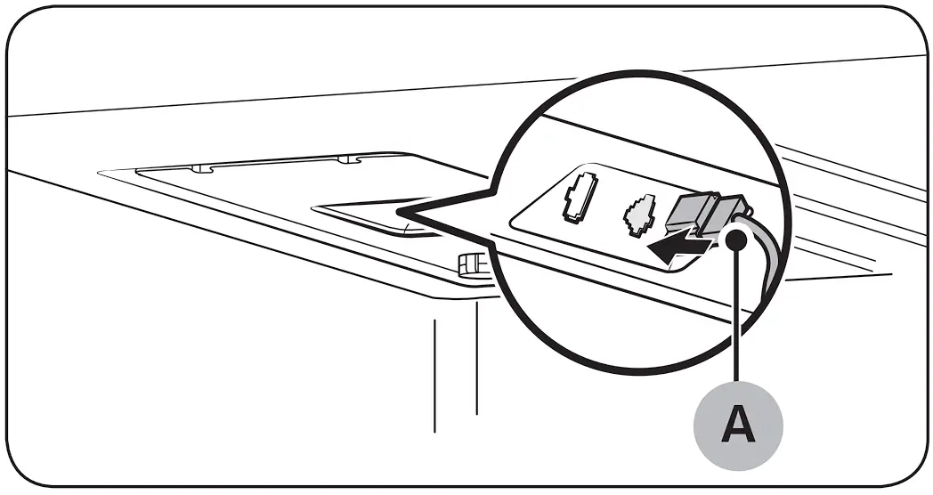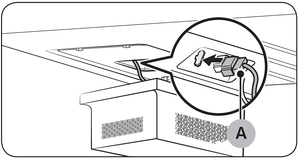- Connect the wire harness (A) of the white water line (which you have inserted through the water inlet on the top of the refrigerator) to the right socket in the freezer. Make sure the connector is fully inserted. (You should hear a clicking sound.)