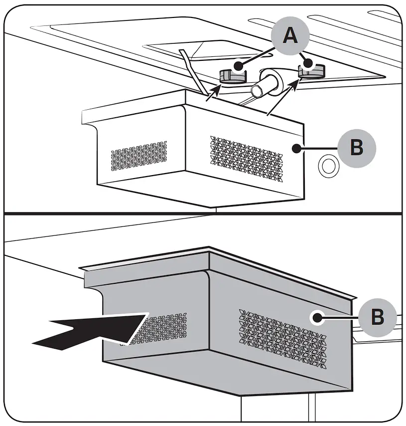 - Insert the water inlet tube (A) (with a white water line) into the water inlet on the top of the refrigerator. Secure the water inlet tube (A) with the hook (B).