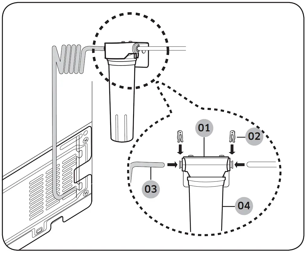 - After connecting the water line to the inlet of the cartridge holder with the plastic line fully inserted, insert and tighten the filter cartridge.