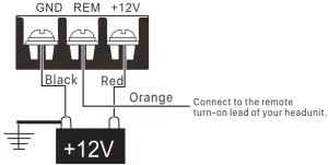 REM. Connect to the remote turn-on lead of your headunit.