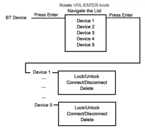 button (6) to enter the Bluetooth menu. Press VOL/ENTER button to enter Bluetooth Settings. Then rotate the VOL/ENTER knob (4) to select Paired Devices and press the VOL/ENTER button to view a list of previously paired mobile devices models.