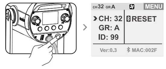 3.1 Bluetooth reset function: in the MENU interface, turn the CCT/FN select dial to choose RESET. Then, short press CCT/FN select dial to reset.