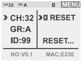 Press the MENU button and the LED light will enter the menu interface. In this interface, CH channel (1 to 32), GR group (A/B/C/D/E/F,0-9), ID (OFF/01 to 99), Bluetooth function (RESET) etc.
