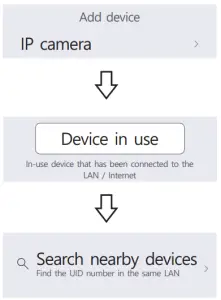 Open The Camhipro App, Select —>“+”—>“IP camera”—>“Device in Use”—>“Search nearby devices”