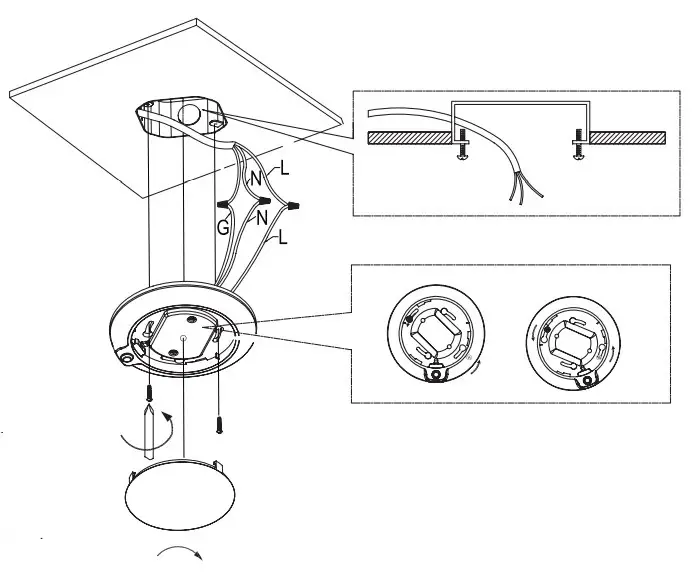 - Thread the mounting screws through the slots in the fixture base and twist the base so that the screws are at the small end of the keyhole slots.