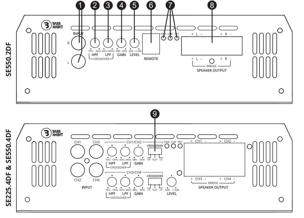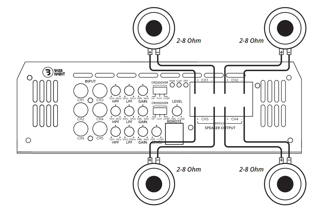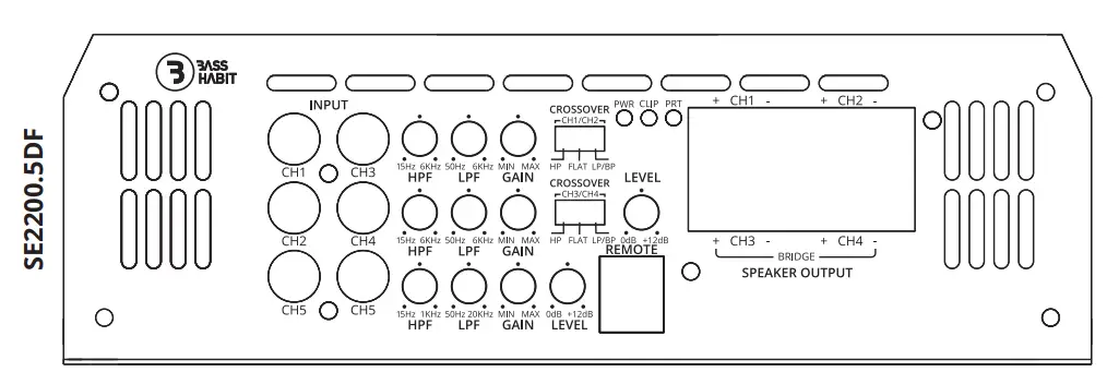 Bass Habit SPL Elite amplifiers are can be used for speakers and subwoofers in the range between 15Hz – 20KHz. On the four channel and five channel amplifiers there is a crossover switch for LOW/FLAT/HIGH mode as well.