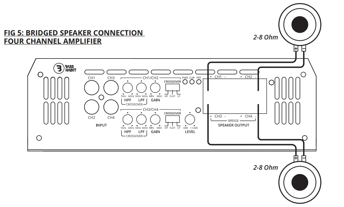 FIG 3: BRIDGED SPEAKER CONNECTION TWO CHANNEL AMPLIFIER